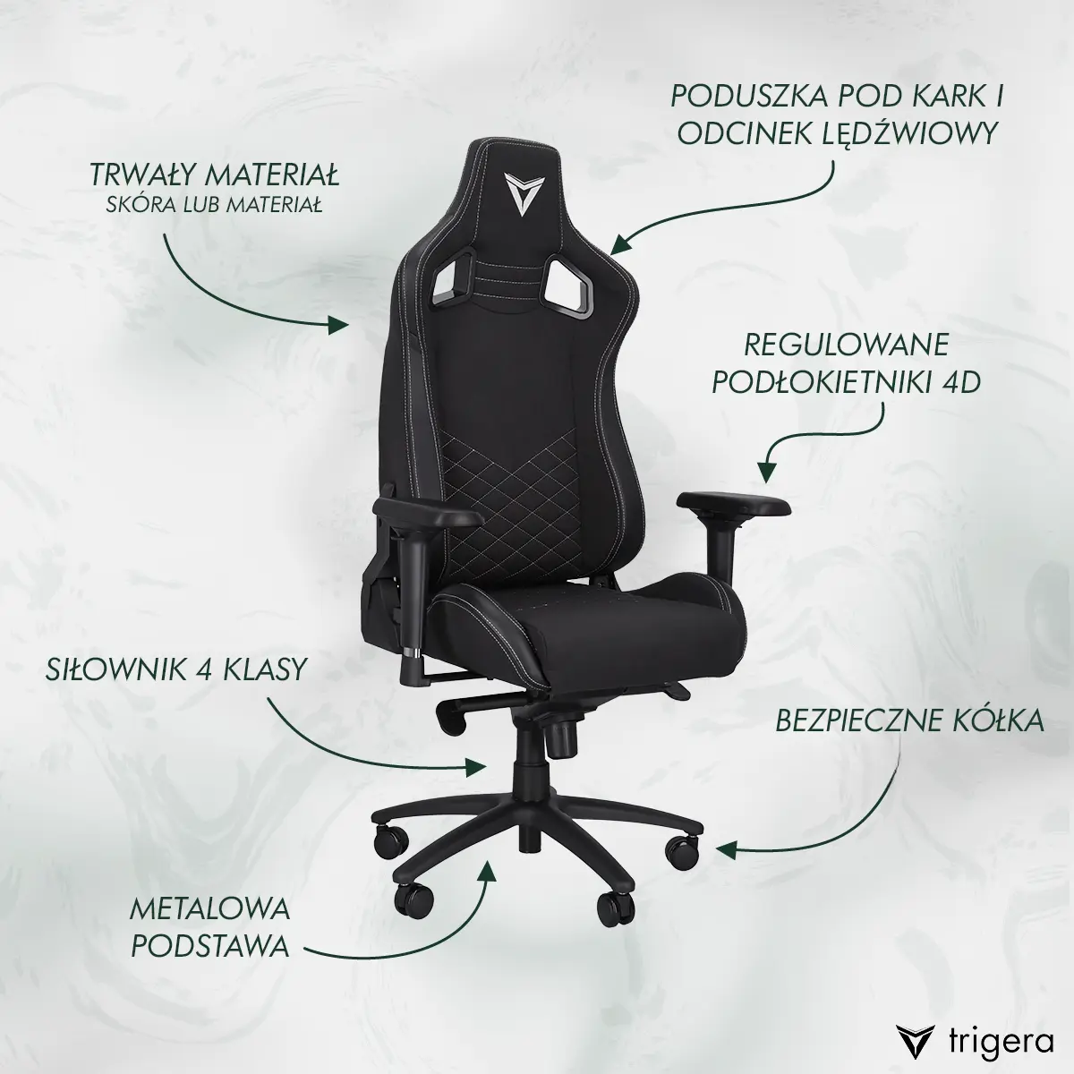 Trigera Two to idealny wybór dla osób, które cenią elegancję, ergonomię i funkcjonalność. Zaprojektowany zarówno z myślą o profesjonalistach, jak i entuzjastach gier, fotel ten jest doskonałym rozwiązaniem dla tych, którzy spędzają długie godziny przy komputerze i pragną najwyższego komfortu. Model Two przemówi do osób, które zwracają uwagę na detale i doceniają minimalistyczny, nowoczesny styl, pasujący do każdej przestrzeni – domowego biura, gamingowego stanowiska czy profesjonalnego gabinetu.