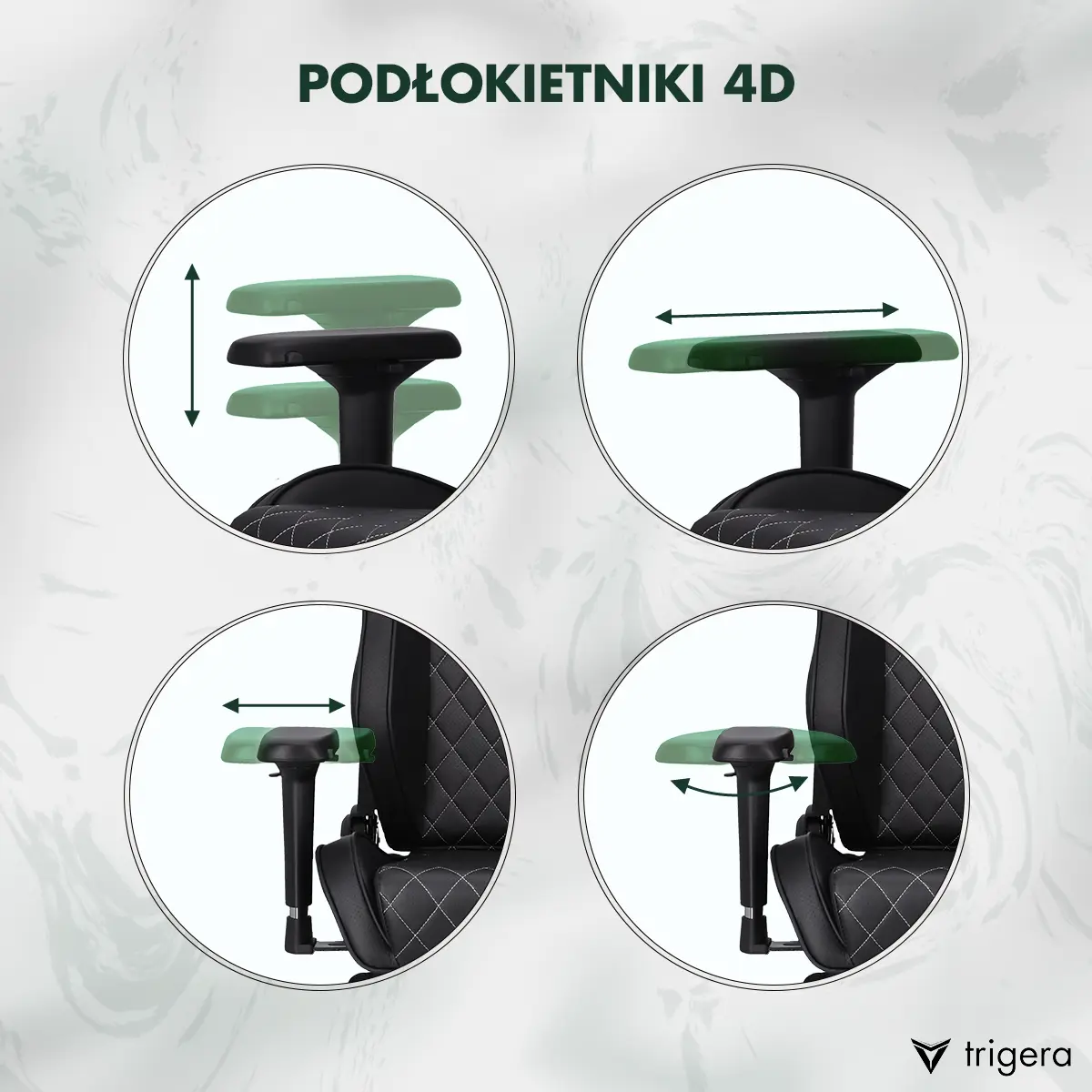 Podłokietniki 4D w fotelu Trigera One to element o wszechstronnej regulacji, zaprojektowany tak, aby dopasować się do indywidualnych potrzeb każdego użytkownika. Umożliwiają ruch w czterech kierunkach:
