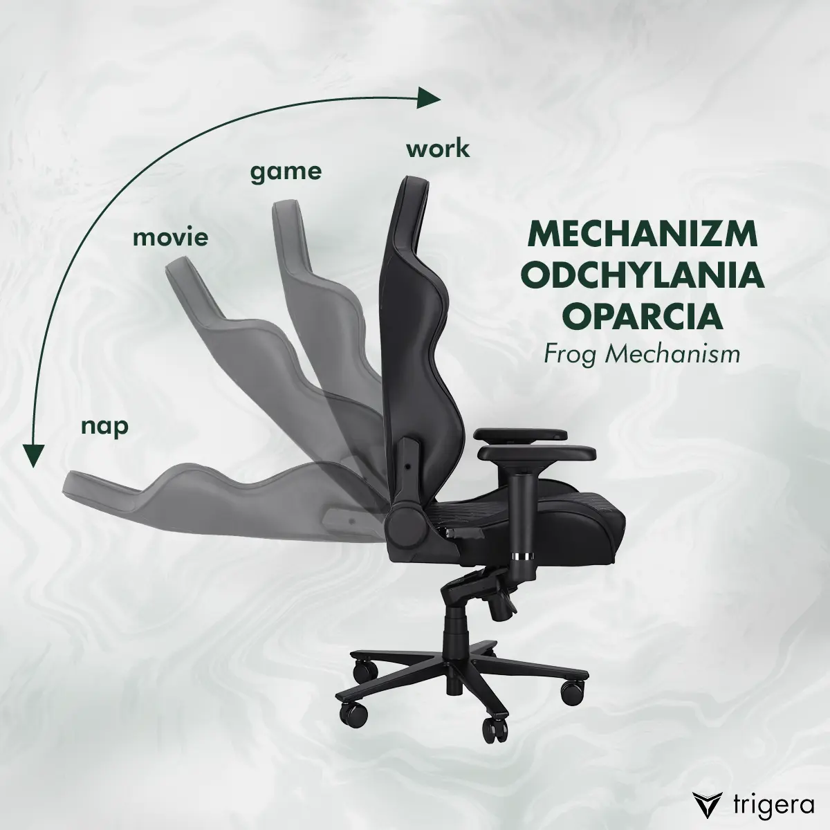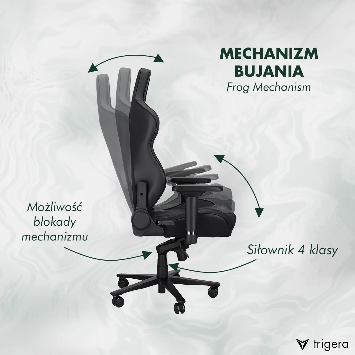 Frog Mechanism, który jest częścią fotela Trigera One, to innowacyjny mechanizm umożliwiający wygodne bujanie, dodające dodatkowy wymiar relaksu. Dzięki niemu możesz rozluźnić się i odprężyć bez wstawania z fotela. Mechanizm ten zapewnia płynny ruch kołysania, idealny do krótkiej przerwy lub chwilowego odpoczynku w trakcie pracy lub gry. Możliwość zablokowania fotela w wybranej pozycji daje kontrolę nad tym, czy fotel pozostanie stabilny, czy będzie poruszał się w rytm Twoich ruchów.