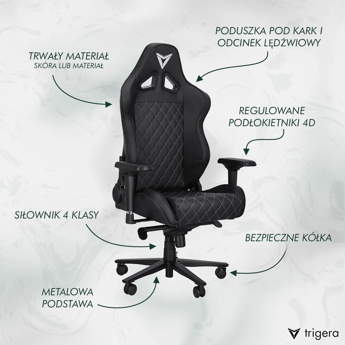 Korzystając z fotela Trigera One, odczujesz, jak pełne wsparcie i ergonomia mogą wpłynąć na Twoją koncentrację i samopoczucie. Każdy dzień pracy lub gry stanie się bardziej komfortowy, a elegancki, harmonijny design doda przestrzeni wyjątkowego charakteru.